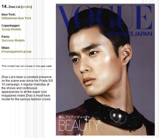 早在2012春夏米兰、巴黎男装周结束后,权威模特网站Models更新的最佳男模排行榜,接连出现在乔治·阿玛尼(Giorgio Armani)、安普里奥·阿玛尼(Emporio Armani)、杜嘉班纳(Dolce&Gabbana)、罗伯特·卡瓦利(Roberto Cavalli)、薇薇恩·韦斯特伍德(Vivienne Westwood、Missoni)秀场的赵磊就已经位居第47,成为首个闯入榜单的中国男模。