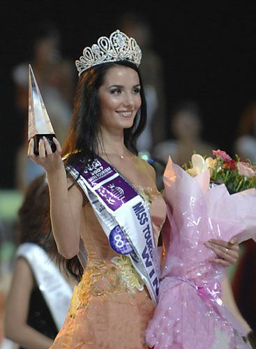 7月31日,俄罗斯旅游小姐萨鲁宾娜手举奖杯。