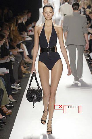 同样是削肩V领设计,Michael Kors这款泳衣则更具有都市的简洁摩登意味。纯黑,纤细的挂脖衣带,拉链前襟,可随意掌握性感的分寸,再以金属材质的阔腰带高高地束起腰部,勾勒完美身材曲线的同时,把现代感和利落的气质衬得淋漓尽致。