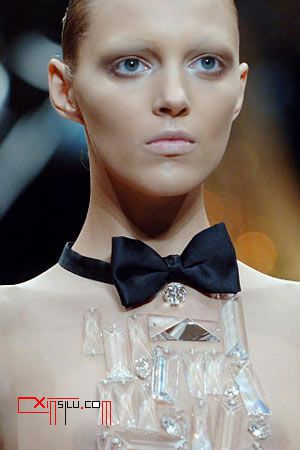 这对创意见长的设计组合,每每在发布会上总有些出人意料的展示。这次的男式礼服领结比起前几季的枕头领子、颠倒裙子来,规矩得几乎让人忘记了Viktor & Rolf的棱角。先不要急着下定论,即使普通的领结也可以搭配出特别的效果,舍弃配套的挺括衬衣,换上半透明的纱质贴身上衣,领结的一本正经,在若隐若现的暧昧的性感中,也柔软了起来。