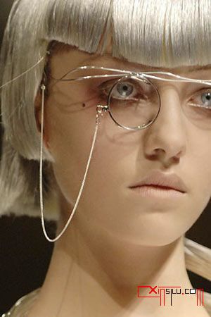 印象中,这种单边的圆框眼镜是电影里的科学怪杰或是耄耋绅士的必备单品,往往带着些偏执和不近人情的暗示。镜架上沿像是随意拗成的样子,却与一丝不苟的小圆镜片和精细的银色挂链组合在一起,也许山本耀司也想借此表达某种近乎怪异的执着精神吧。