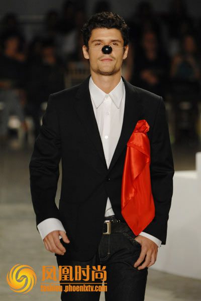 2007年6月13日,巴西圣保罗,著名品牌Fause Haten2008夏季时装周举行,鹅黄、翠绿、肉桂华服缤纷夺目,炎炎夏日狂刮绚丽飓风,男模特将艳红领带别在胸口大玩另类,女模特的小丑图案吊带茧型裙个性十足。