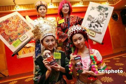 图为身穿民族服饰的亮丽模特,向大家展示中国四大名锦: