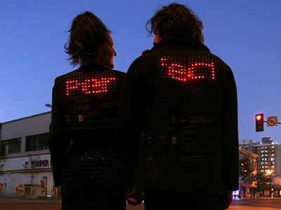 4. 这是带电子显示标语的服装,当两个穿着这种服装的人握手时,他们衣服上就会显示出更多的文字。