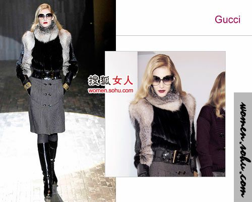 picture3:Fatale 致命吸引力 Romina Lanaro以大波浪金发、石榴红双唇和大镜框太阳眼镜的造型,出现在Gucci的发表会上。她这身打扮的灵感来自于Lee Miller,此人在三○至四○年代,由模特儿转任摄影师,后来又当上流行时尚的记者,是一个非常有Helmet Newton味道的偶像。