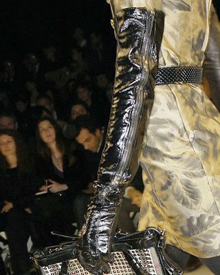 泛出乌金光泽的过肘皮质长手套包裹住纤细的手臂,手套温暖的感觉被冷硬的金属感材质掩盖住了。Burberry本季以饰品来呼应未来主义,过肘皮质长手套几乎成为本季的时尚符号,施展魔法般变奏出狂野不羁的风情。
