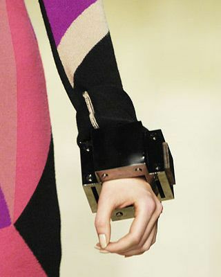 Emilio Pucci 狂放不羁的冷硬酷感手镯与明快柔美的服装形成鲜明对比,简单时尚又酷劲十足, Pucci以明亮色彩、几何印花图纹,配合重金属质感的宽手镯,营造出未来感与女性韵味时髦气韵的完美组合。在大都市的茫茫人海中,很容易让人有眼前一亮的感觉。