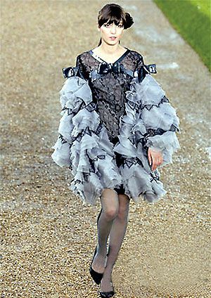 并不是只有迎来周年庆的大师们才值得称赞。在Chanel耕耘了整整20个年头的KarlLagerfeld此番借助于生动的线条———横线与竖线共存在窄小和谐的裙装上,三角形的裙角层叠成花瓣模样,甚至出现菱形的全身长裙,及带有中东色彩的金字塔廓形,其剪裁与缝边技巧的精到,让人联想到趣稚的几何课堂,虽然整体依旧以简朴的黑白色调为主,试图出位的热情却洋溢其中。与之产生同样效果的还有ArmaniPrivé两片扇片式胸衣的礼服裙,JeanPaulGaultier羊皮与纱质的混搭,军装、旗袍与晚礼服的绝妙组合,ChristianLacroix夸张幽暗的歌特式长裙,Givenchy恰似动物一般的皮草与羽毛披被……无不令人叹为观止。
