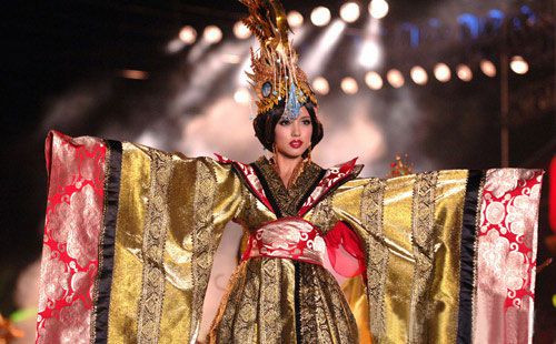 11月24日,中国小姐张梓琳在三亚华宇皇冠假日酒店展示中国传统的华服。