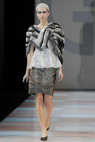 黑灰相间的皮草本身就会给人一种华丽高贵的感觉,这款设计让皮草展现出它在形状上的可塑性,一整块皮草的披肩从颈上搭过来,在胸前做了简单的转折,制造出优雅的褶皱。不需要靠其他的装饰物,只要一个巧妙的形状改变,就呈现出特别的装饰感。