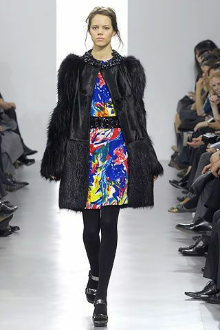 在黑色长风衣的手臂和下摆两处拼贴了同色系的皮草,皮草的材质很薄,好像一层温暖的羽毛附着在手臂上,虽然是秋冬,却也给人一种轻快的华丽感。衣领的部位用了晶莹的亮片堆积来做装饰,和皮草雍容的质感形成鲜明对比,从细节中打造女性别具一格的美。