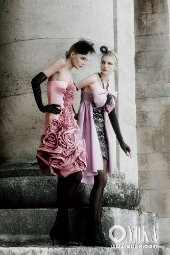 (左)玫瑰礼服裙 Valentino高级订制;帽子Leah C. Couture Millinery