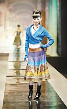 时尚看点:邓皓对于色彩搭配有绝妙掌控力,她以绿色为底色,搭配了其他高饱和度、高对比度的色彩,像画油画一般展现了女装抑扬顿挫的魅力。将针织与梭织面料进行特性组合,同时大量运用精细的刺绣、镶花、镂空、辑线,结合蛋形、腰果形、管形等国际流行结构,在东西方的古典文化及纹案合而为一的和谐美感中,将设计师充满艺术感和张扬贵气的性格表现得淋漓尽致。