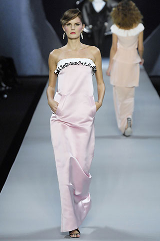 同去年拙劣的钢铁系列构思相比,今年在白色、粉色和黑色系列中采用的应景纸花装饰至少还不会影响穿着。然而,如果这些装饰被镶嵌在长款外套的肩部,实在只能供小丑打扮了。