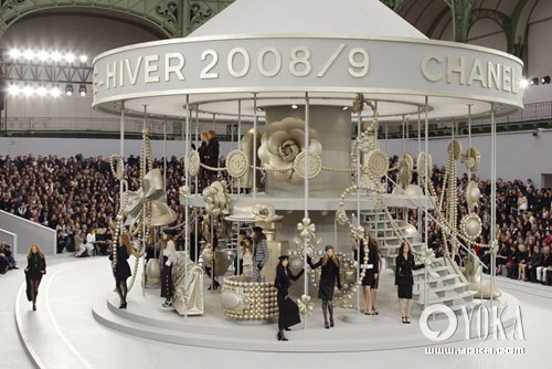 08年的秋冬秀上,Karl将一座巨大的由Chanel经典产品组成的旋转木马搬上舞台,整个现场如同梦幻一般,将在场所有的观众带入到一个童年的美梦中。这一次的秀上,Karl将品牌经典的双色设计从鞋子延伸到了袜子上,前浅后深的袜子设计让腿部线条看起来更加优美,相信很快便会成为热卖商品。这次展示的时装还带有一些中世纪的复古气息,融合了现代精湛的面料缝制、加工技术,更显得摩登又贵气。