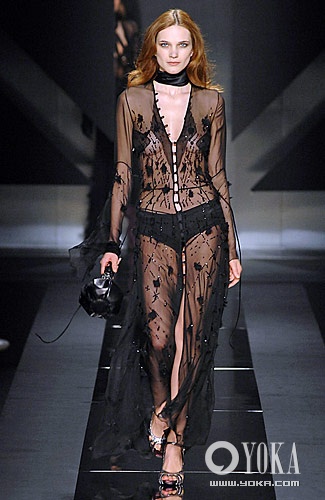 本季John Richmond用蕾丝、流苏和水钻诠释出的性感风潮,将性感表现得既含而不露,又兼具狂野的特征。黑色半透明上衣搭配不同材质的裤子,用面料材质上的变化将原本繁复的款式变得更加轻薄精致。用双排扣西装搭配个性长裤,是英伦设计师的惯用伎俩,将优雅精致和疯狂不羁相结合,没有突兀,只有十足的个性时尚。