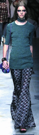 一直都锐意求新的Prada今季将喇叭裤放上了T台,再赋予迷幻的几何花纹,是那个年代最盛行的嬉皮风的现代演绎。 Tips ●略带凌乱效果的中分长发,最适合与1970年代的服装搭配。 ●中性的装扮自然不需要太多修饰,肉色的唇色、看起来健康的橙色系腮红,当然还需要有英气的浓眉。