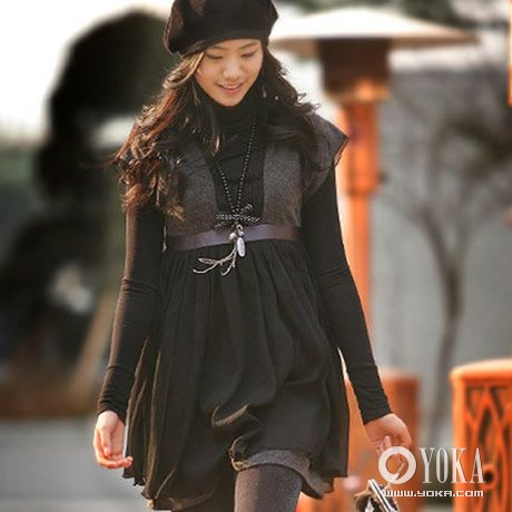 双层荷叶边设计的娃娃裙很有公主气质,黑色又增添了几分休闲感,搭配贝雷帽更具成熟意味。