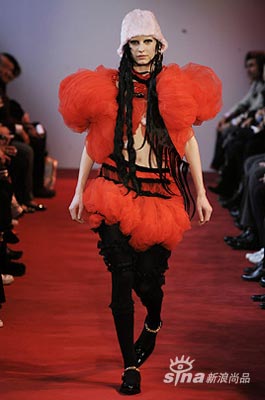 Rei Kawakubo 的Comme Des Garcons发布会上,模特被红色薄纱组成的鲜艳的锦簇和内衣皮带所包裹。