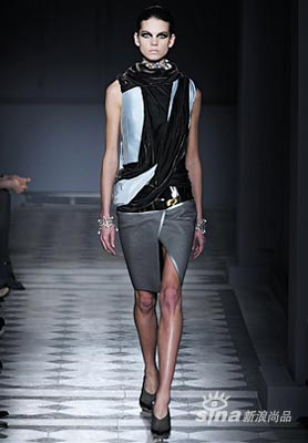 Balenciaga的设计师Nicolas Ghesquière把传统面料与高科技面料混合在一起。天鹅绒、背面是橡胶的绸缎、透明硬纱构成柔和精致的轮廓。