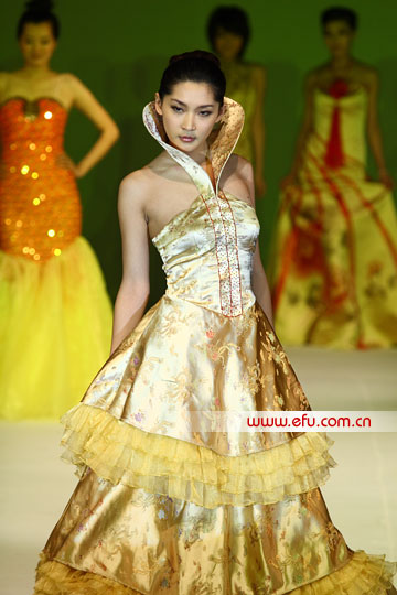 款式设计上,在保持中国传统文化风格的同时,大量融入时尚的元素。基于中国文化,用现代的表现手法来演绎中式服装。利用多种设计手法,改变中式服装固有的廓型,而采用现代流线造型,加以精湛的绣花,图案设计,去凸显具有中国文化元素的服装,在现代人们的日常生活中,可以更加时尚,璀璨起来。比如青花瓷系列在款式设计上就以青花瓷器为廓型,结合中式设计精髓,以丰富多彩的青花图案,用不同的表现手法,演绎出一幅具有中国水墨画般浓郁而又具有渲染效果,让人为之品位的青花画卷。而黑白灰系列在款式设计上运用不同面料的混搭,利用绣花,订珠等工艺对服装面料,款式进行二次加工,以微妙的细节处理,强调色彩、材质以及剪裁的设计。素淡自然的色调,将东方女性的端庄、贤淑之美传递的淋漓尽致。