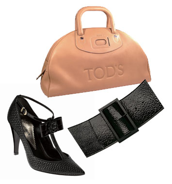 推荐搭配单品 米色皮质手袋 TOD’S;黑色束带高跟鞋 Emporio Armani;黑色漆皮宽腰带 Salvatore Ferragamo