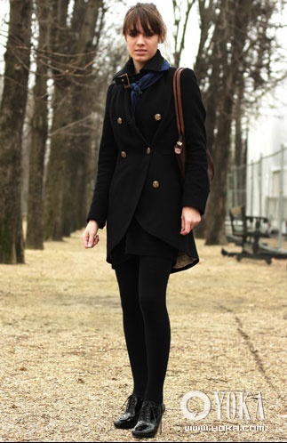 这件大衣的不同之处就在于其底边的圆弧设计,很有军装的感觉。在隐约的露出里面的连衣裙,这让整体看上去不再单调。