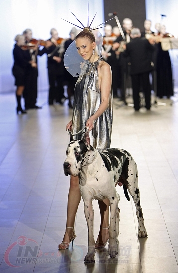 在乌克兰基辅的时装周上,一名模特带着狗上台展示设计师阿列克西·扎列夫斯基的作品。
