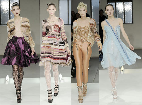 从Rodarte 可以发现纽约时尚周的另一个新起点:更先锋实验派的繁复设计也逐渐得到了接纳与重视。设计师姐妹Kate和LauraMulleavy给人带来的是完全女性化的柔美印象。她们的08秋冬系列有着童话故事中仙女般的唯美气质,却又隐隐带着一股强势。轻透感很强的薄纱成为贯穿始终的主打面料,虽然在整体造型上仍显借鉴的痕迹。这被解释成风格近似也好,精心偷师也罢,通过对拼接、染色和蕾丝、亮片等方式与材料的运用把握,至少说明了她们是在用自己的方式去表达时装。