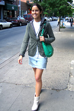 姓名:Jocelyn Jeffery 抓拍地点:伊丽莎白大道 外套:James Perse ,连帽衫American Apparel ,T恤“旧男友留下来的旧东西~ ”,牛仔迷你裙Levi's ,靴子Mayle,还带有一口袋书!!!!