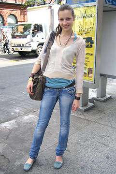 姓名:Asia Pulco 抓拍地点:West Broadway “哦,你们问我穿的是什么,恩,这件小毛衫是从日本旅行回来的战利品,里面的小背心是H&M,牛仔裤是Replay,鞋子是Steve Madden。” “我喜欢在这个季节尝试搭配所有我喜欢的色彩!”