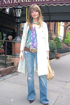 姓名:Brooke Geahan 抓拍地点:Gramercy Park 穿着:一件二手真丝外套(哦,这件古董衫是我的合作伙伴送给我的,非常适合我的气质,我很喜欢~),里衫Ruffian,首饰是从妈妈的珠宝盒里偷偷拿出来戴的(嘿,你们这些家伙不会把照片登在时尚上吧?千万不要,我相信我妈妈会看见的!),牛仔裤 Rogan jeans,鞋 Kate Spade