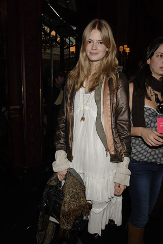 Julia Stenger:又是皮夹克+雪纺长裙的混搭;铜金色皮质夹克看起来华美复古,搭配白色层叠宽松长款连衣裙,一股吉普赛风扑面而来;她的金色头发和胸前的金色细长项链增色不少;个子不够高的mm慎重尝试这种款式的裙子。