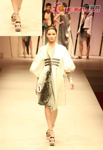 中国首席名模莫万丹作为开场模特第一个登场,演绎唐式风格设计。莫万丹身穿作品,腰部汉字直接化成了“三”型,形成宽阔腰带,写意、实用。脚上的漆皮鞋子,色泽与衣服保持高度一致,让整套设计更加和谐美观。