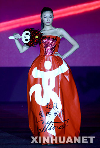 3月27日,一位模特在北京举行的中国国际时装周意大利“永恒之城罗马高级时装发布会”上,展示意大利时装设计师为祝福北京奥运而推出的时装。