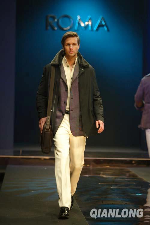 休闲上衣、夹克将材质的拼接、搭配运用到了极致,采用的拼料或是同色异质,或是同色系、异花型,远看色调和谐,近看层次丰富;大衣、风衣、棉服类的设计细节变化繁多,结构奇特的异型雨肩既有防风保暖的实际功能又令服装显得与众不同;棉服外加的一层毛绒风帽背心,在保暖的基础上添加了新奇时尚的元素;由系列灰阶色调组成的毛衫、儒雅的浅灰白的开襟高领衫、细腻的人字纹双层领套头衫以及节奏简洁明快的横条衫,彼此间形、色各异,放在一起又浑然一体,为本季ROMA男装增添了活泼、迷人、性感的内容;皮衣的材质也是品种多样,直皱皮、油光皮、腊变皮在强光下各种风格性的肌理呈现出丰富而雅致的光泽,短款设计上添加了很多立体感强的细节,令款式轻松时尚;长款在细节设计则比较含蓄,整体风格儒雅俊逸适合于商务。