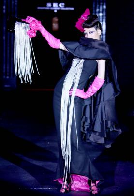 他出生在这个城市里,现在又用他的作品来诠释着他热爱的这一切,当发布会结束时那个“旧上海的女人”和一个男子携手出现在了人们面前,她深情的注视着这个男子,是的,她在寻找、在等待、同时又在期盼的就是祁刚的08/09秋冬高级成衣发布会! 对面料的选择和搭配也呈现大呼丰富而细腻的匠心,玫红、夜空蓝与黑色的搭配,结合出悦目而华丽的色彩感受,整体看来统一而并不缺乏变化。这套枚红色的缎面鱼鳞装搭配钢板腰封,看出他对细节给于了更多的关注。整体来说这件服装是他对“梯”廓型与多层次、层叠、百褶结构结合的代表作品。