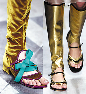 [斯文搞怪类] 长筒兼平底 长筒和凉鞋看起来很矛盾,但Prada今春就成功得将这两个“九唔搭八”的元素搅和到一起。如冬靴一样的高筒下面是露出脚面的平底凉鞋款式,穿上这双怪异的鞋子,就如一个另类潮人活脱脱地从时尚杂志中奔出来一样。 而Marc Jacobs的金色软皮平底靴就相对“保守”地演绎着这一时尚,其犹如小妖精的魔法鞋,粉红色、橙色和碧绿色等夺目艳色令人印象难忘。风格类似上世纪50年代鸡尾酒会的鞋款,在脚踝部佩有细小鞋带,充满女人的妩媚;材质多为具有打磨效果的天然织物或羊皮,凸显舒适新纬度。