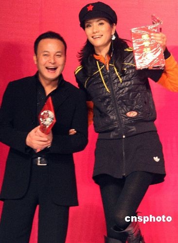 图为中国名模陈娟红、造型师毛戈平在颁奖仪式上