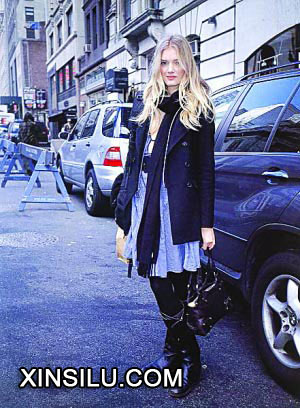 如果还冷就再围上围巾,穿上打底裤、长靴,就像Lily的另一身混搭装扮。