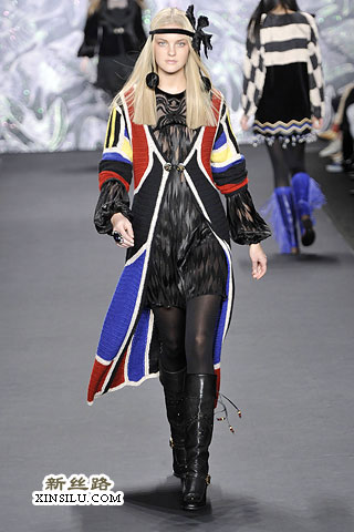 在后台,Anna Sui谈到了她本季的主题:新艺术运动、拉菲尔前派、蒂凡尼的花瓶、丝绸碎褶、古斯塔夫•克里姆特,对了,还有西北太平洋地区的美洲印第安人。一场美丽的大杂烩?也许有些人是这样认为的。