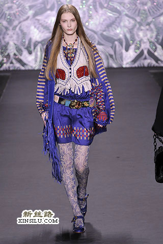在后台,Anna Sui谈到了她本季的主题:新艺术运动、拉菲尔前派、蒂凡尼的花瓶、丝绸碎褶、古斯塔夫•克里姆特,对了,还有西北太平洋地区的美洲印第安人。一场美丽的大杂烩?也许有些人是这样认为的。