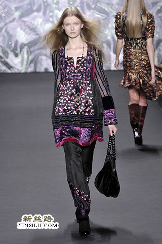 在后台,Anna Sui谈到了她本季的主题:新艺术运动、拉菲尔前派、蒂凡尼的花瓶、丝绸碎褶、古斯塔夫•克里姆特,对了,还有西北太平洋地区的美洲印第安人。一场美丽的大杂烩?也许有些人是这样认为的。