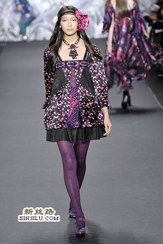在后台,Anna Sui谈到了她本季的主题:新艺术运动、拉菲尔前派、蒂凡尼的花瓶、丝绸碎褶、古斯塔夫•克里姆特,对了,还有西北太平洋地区的美洲印第安人。一场美丽的大杂烩?也许有些人是这样认为的。