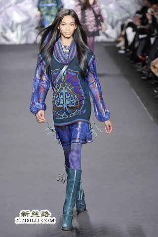 在后台,Anna Sui谈到了她本季的主题:新艺术运动、拉菲尔前派、蒂凡尼的花瓶、丝绸碎褶、古斯塔夫•克里姆特,对了,还有西北太平洋地区的美洲印第安人。一场美丽的大杂烩?也许有些人是这样认为的。