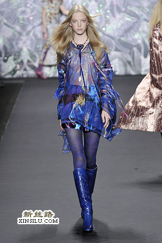 在后台,Anna Sui谈到了她本季的主题:新艺术运动、拉菲尔前派、蒂凡尼的花瓶、丝绸碎褶、古斯塔夫•克里姆特,对了,还有西北太平洋地区的美洲印第安人。一场美丽的大杂烩?也许有些人是这样认为的。