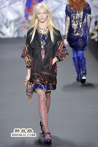 在后台,Anna Sui谈到了她本季的主题:新艺术运动、拉菲尔前派、蒂凡尼的花瓶、丝绸碎褶、古斯塔夫•克里姆特,对了,还有西北太平洋地区的美洲印第安人。一场美丽的大杂烩?也许有些人是这样认为的。