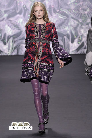 在后台,Anna Sui谈到了她本季的主题:新艺术运动、拉菲尔前派、蒂凡尼的花瓶、丝绸碎褶、古斯塔夫•克里姆特,对了,还有西北太平洋地区的美洲印第安人。一场美丽的大杂烩?也许有些人是这样认为的。