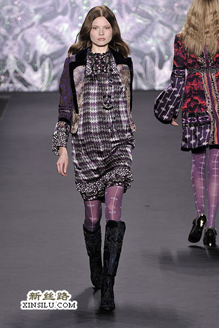 在后台,Anna Sui谈到了她本季的主题:新艺术运动、拉菲尔前派、蒂凡尼的花瓶、丝绸碎褶、古斯塔夫•克里姆特,对了,还有西北太平洋地区的美洲印第安人。一场美丽的大杂烩?也许有些人是这样认为的。