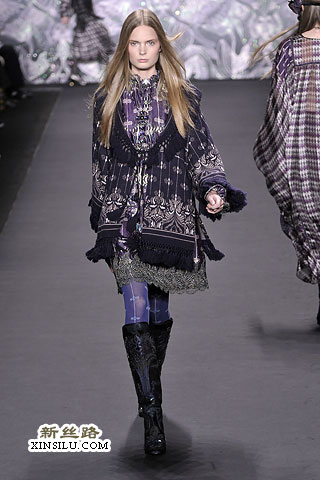 在后台,Anna Sui谈到了她本季的主题:新艺术运动、拉菲尔前派、蒂凡尼的花瓶、丝绸碎褶、古斯塔夫•克里姆特,对了,还有西北太平洋地区的美洲印第安人。一场美丽的大杂烩?也许有些人是这样认为的。